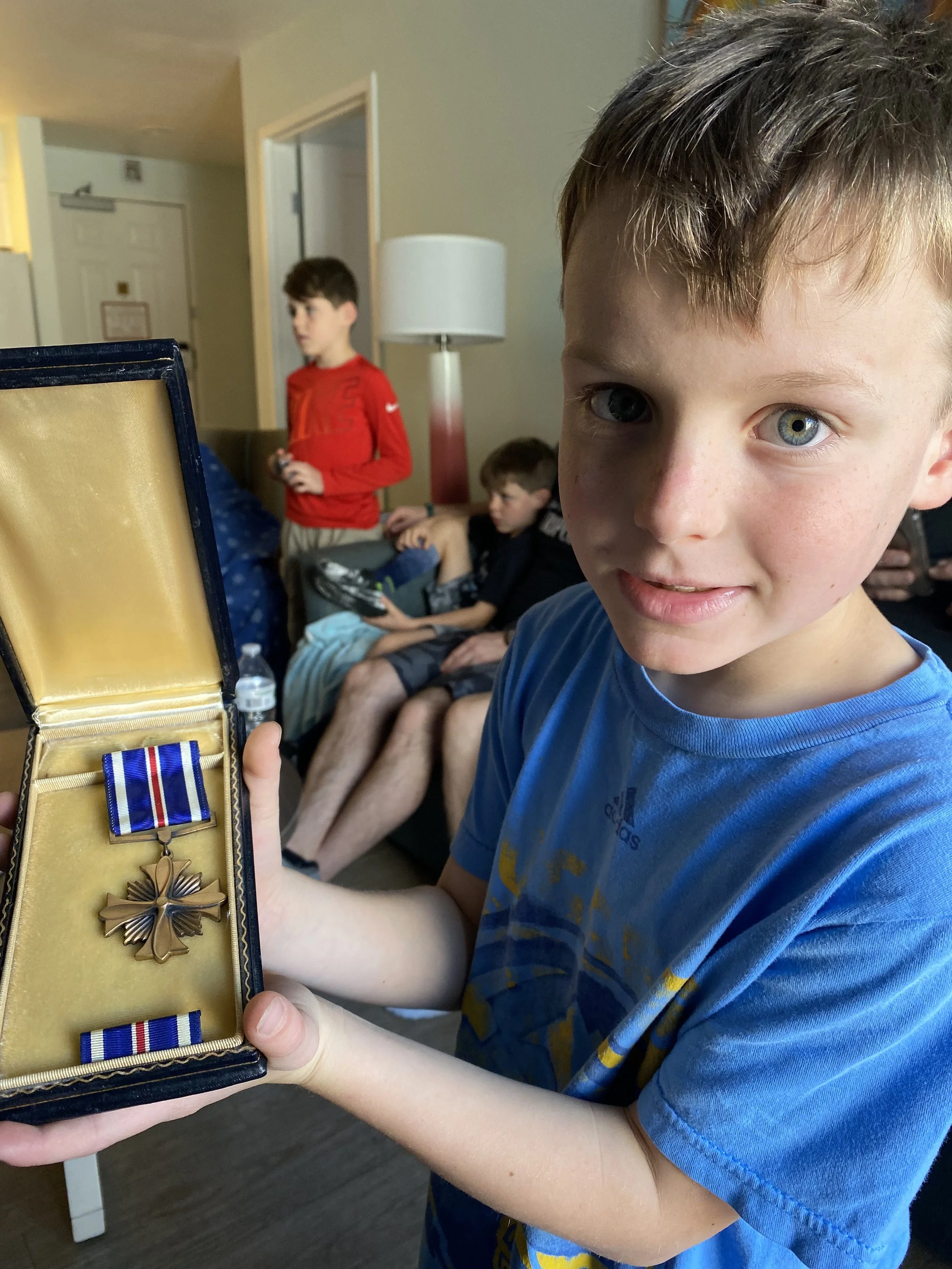 McKade holds The Distinguished Flying Cross of his Great Grandfather Moyer from World War II - November 20, 2022, San Diego, California
