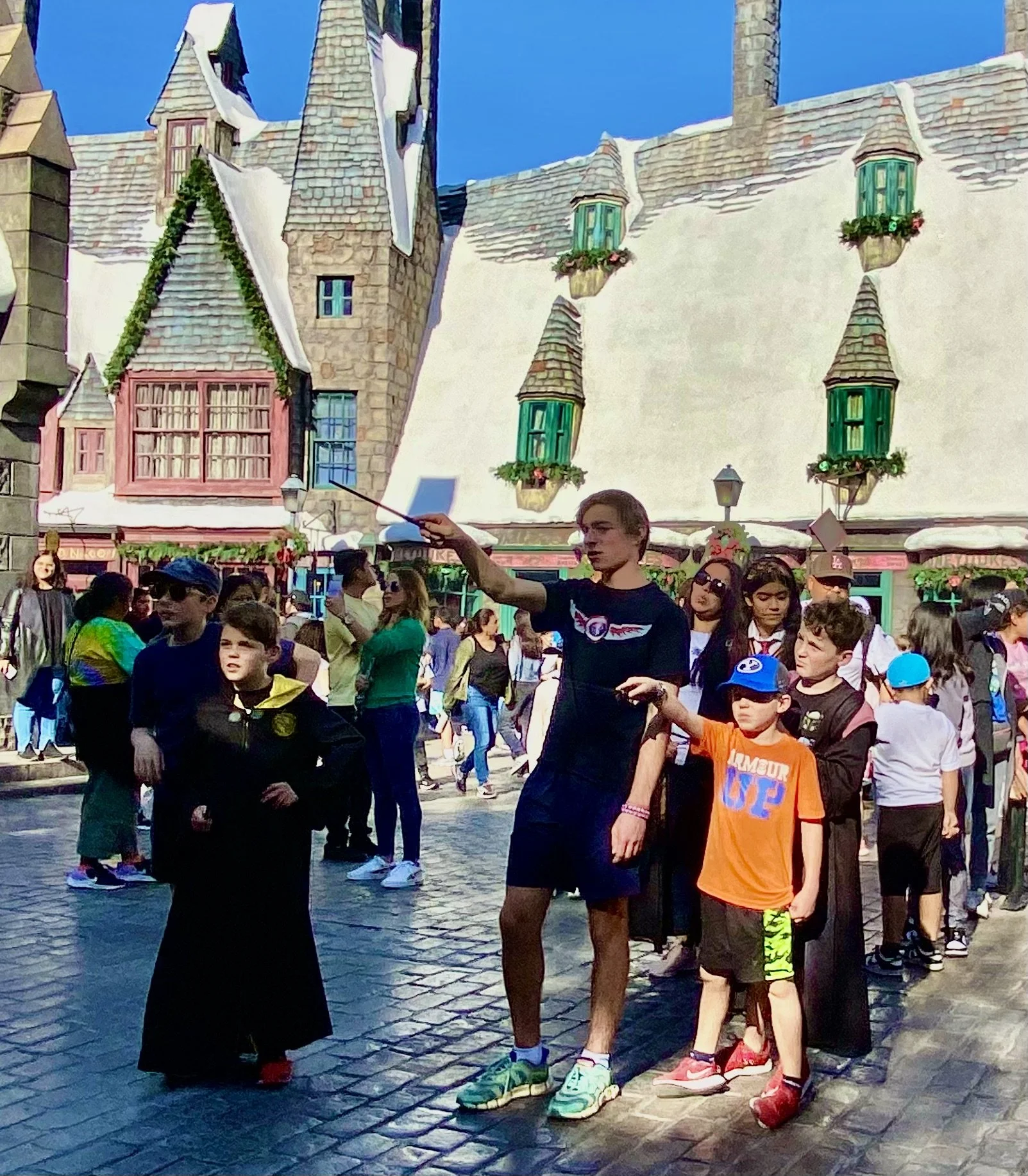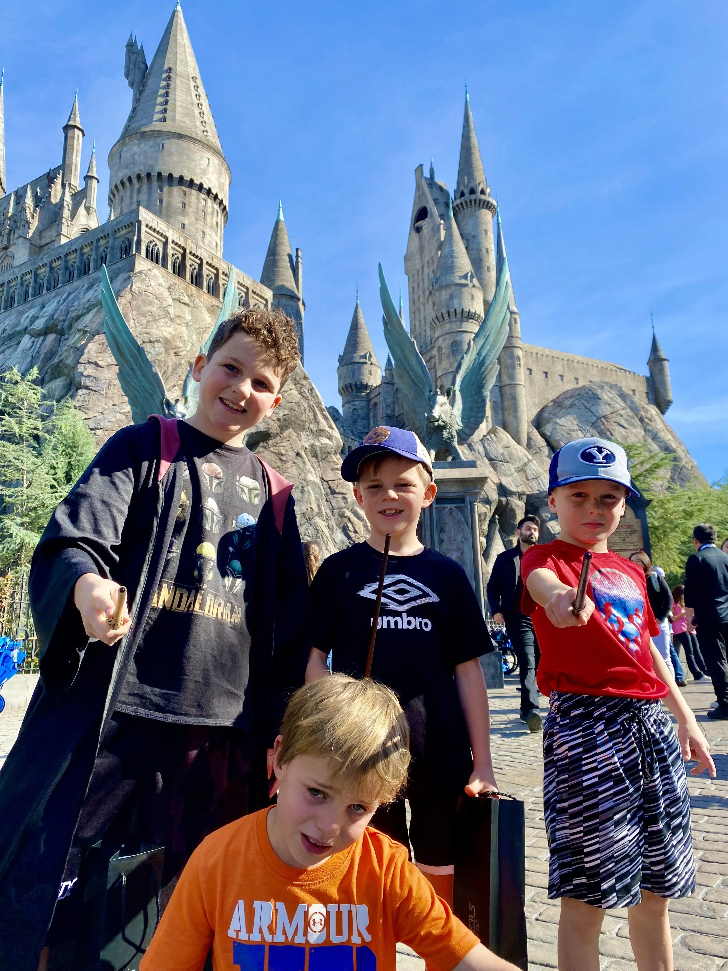 Casting spells in Harry Potter World: Caleb, Jacob, Bowen and Beckett.