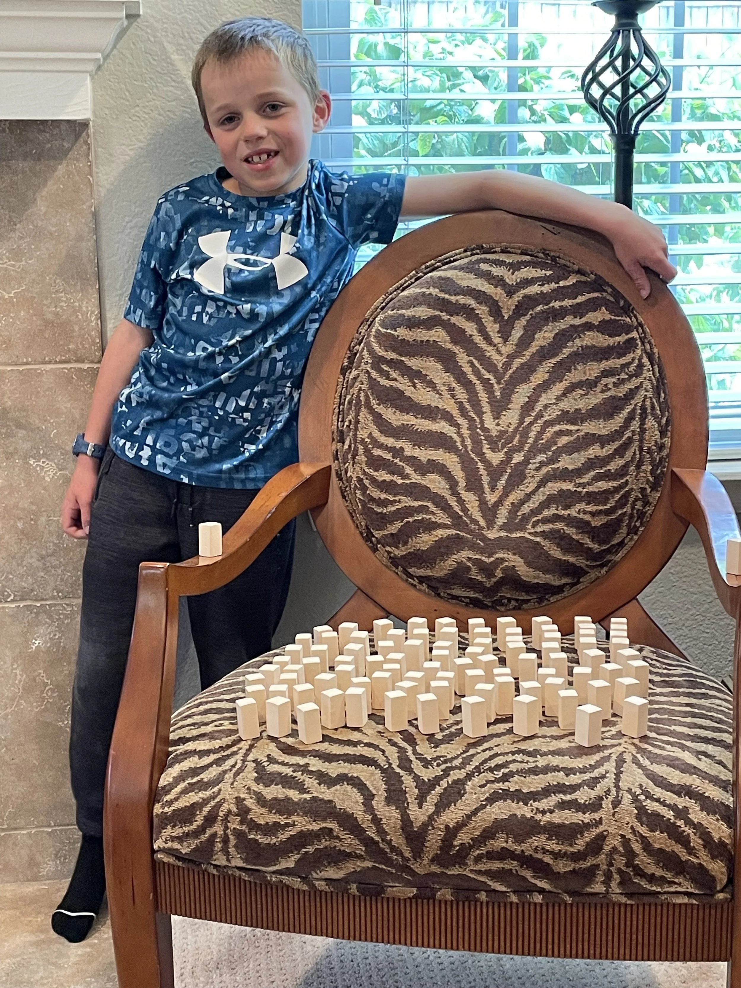 Zeke, age 7, builds with Jenga while Grandpa and Bowen shovel during a May snowstorm.