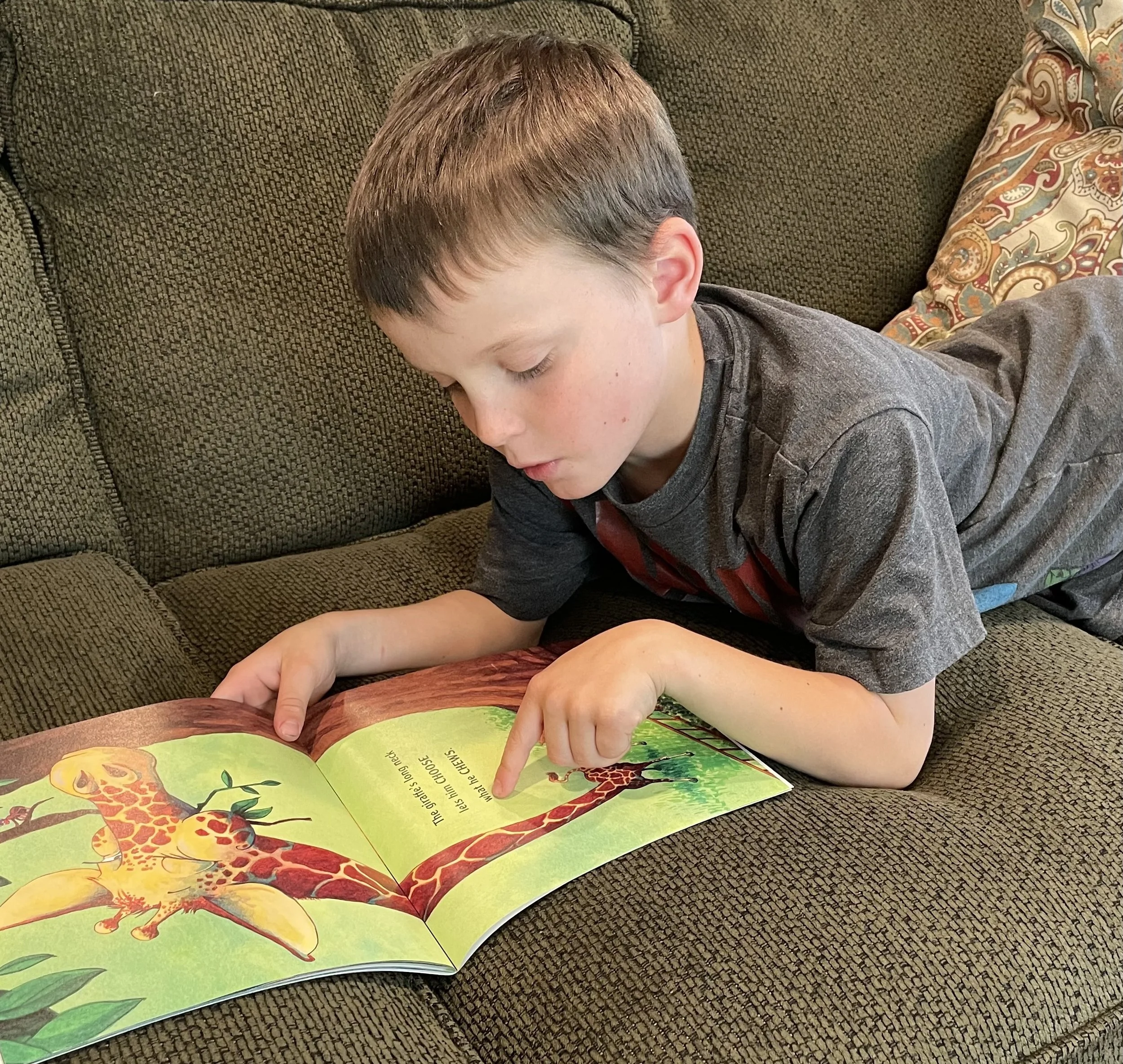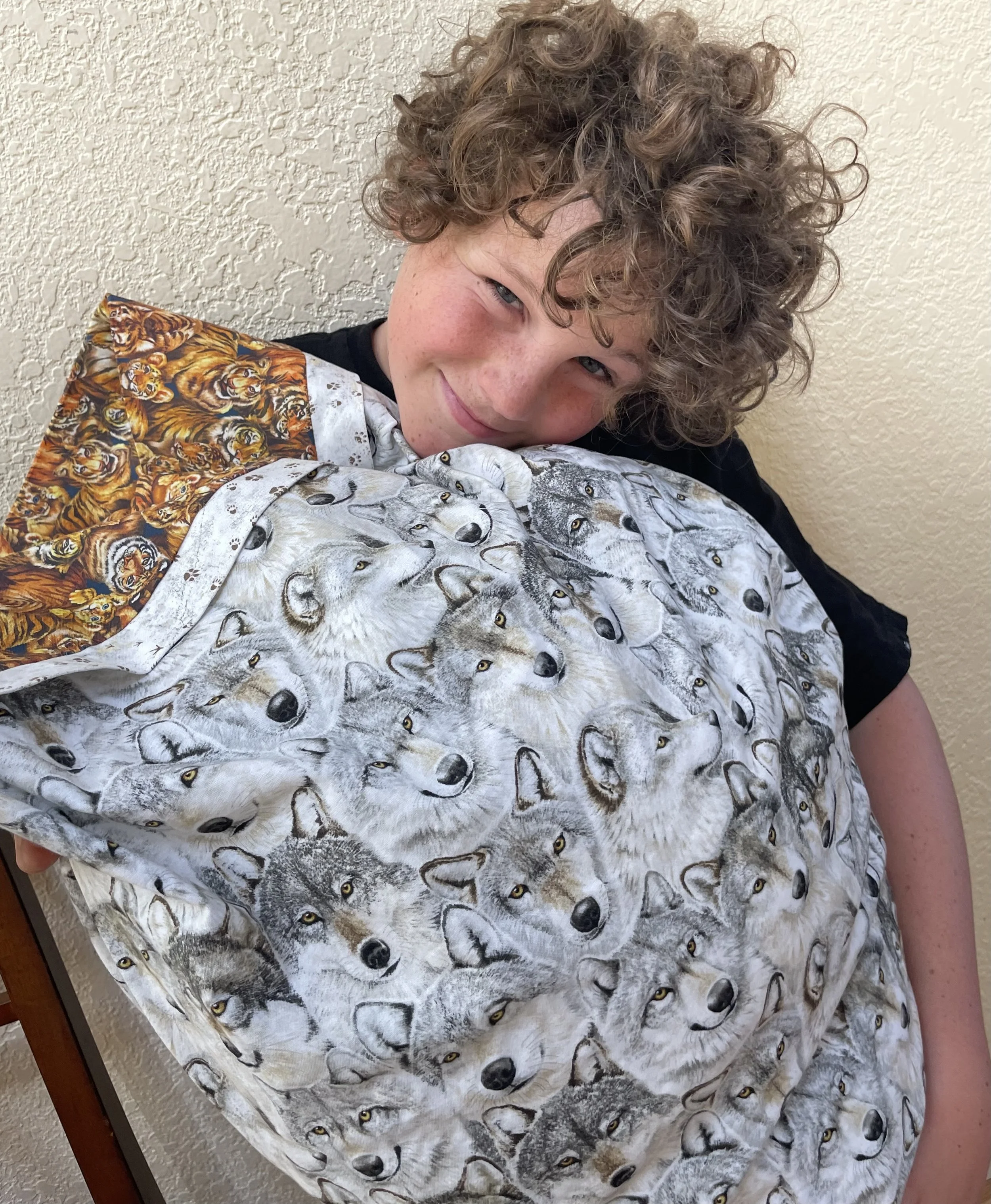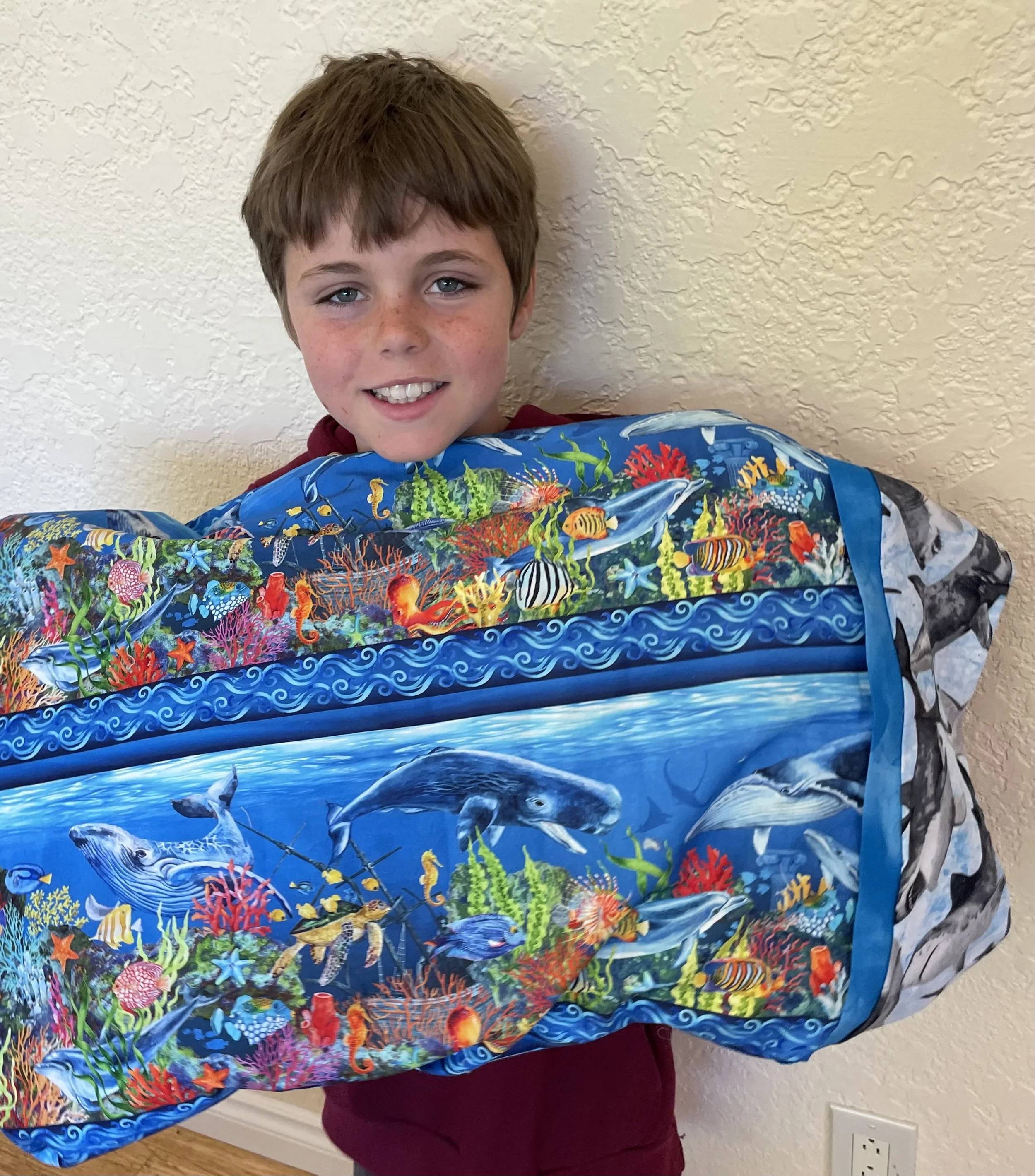 Caleb, age 9, in Oregon, June 2022 - pillowcase Grandma Judy helped him make!
