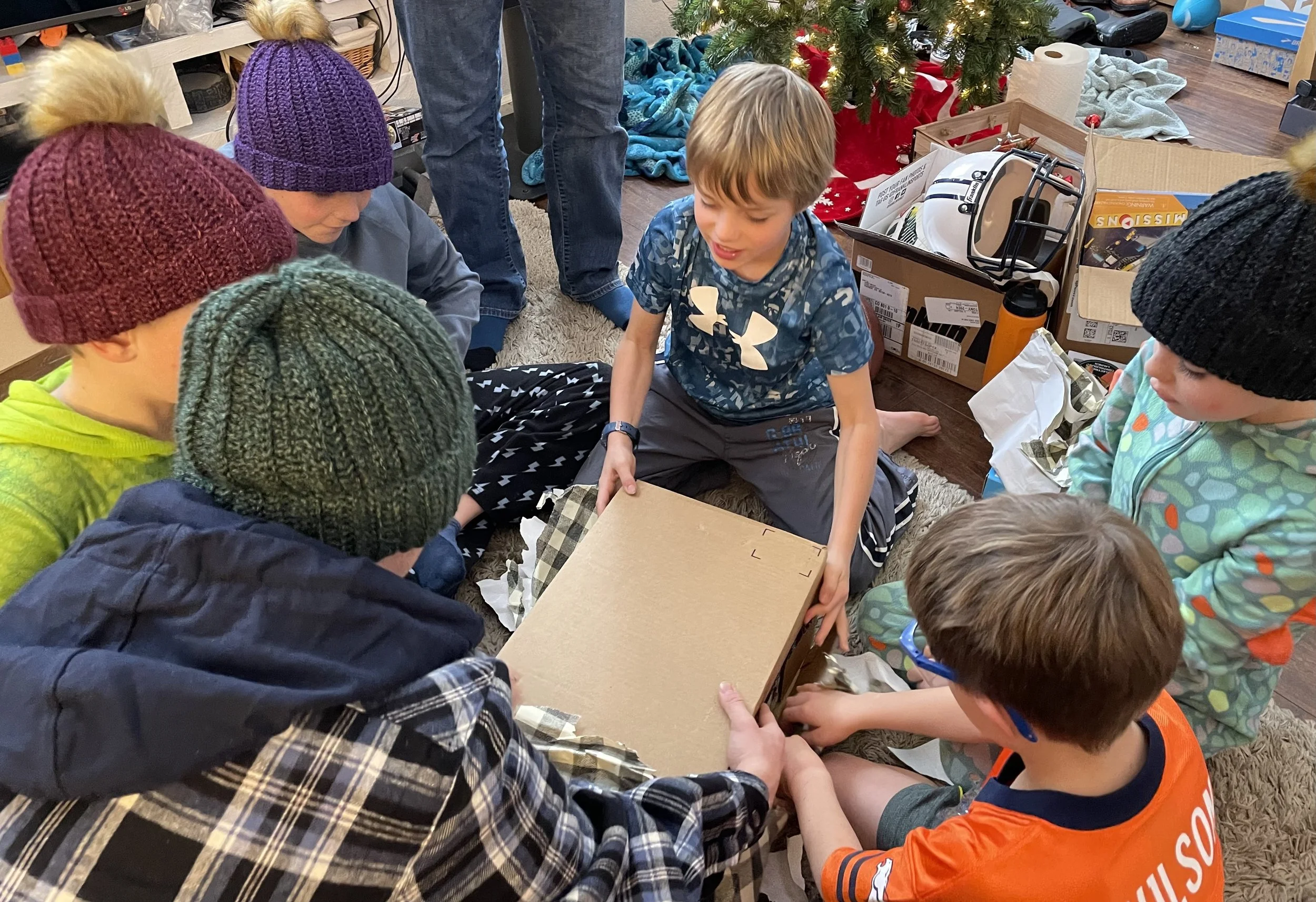 Christmas morning…several boys are wearing the hats knit by their cousin, Aida. Together they are opening the present from the Gates family.