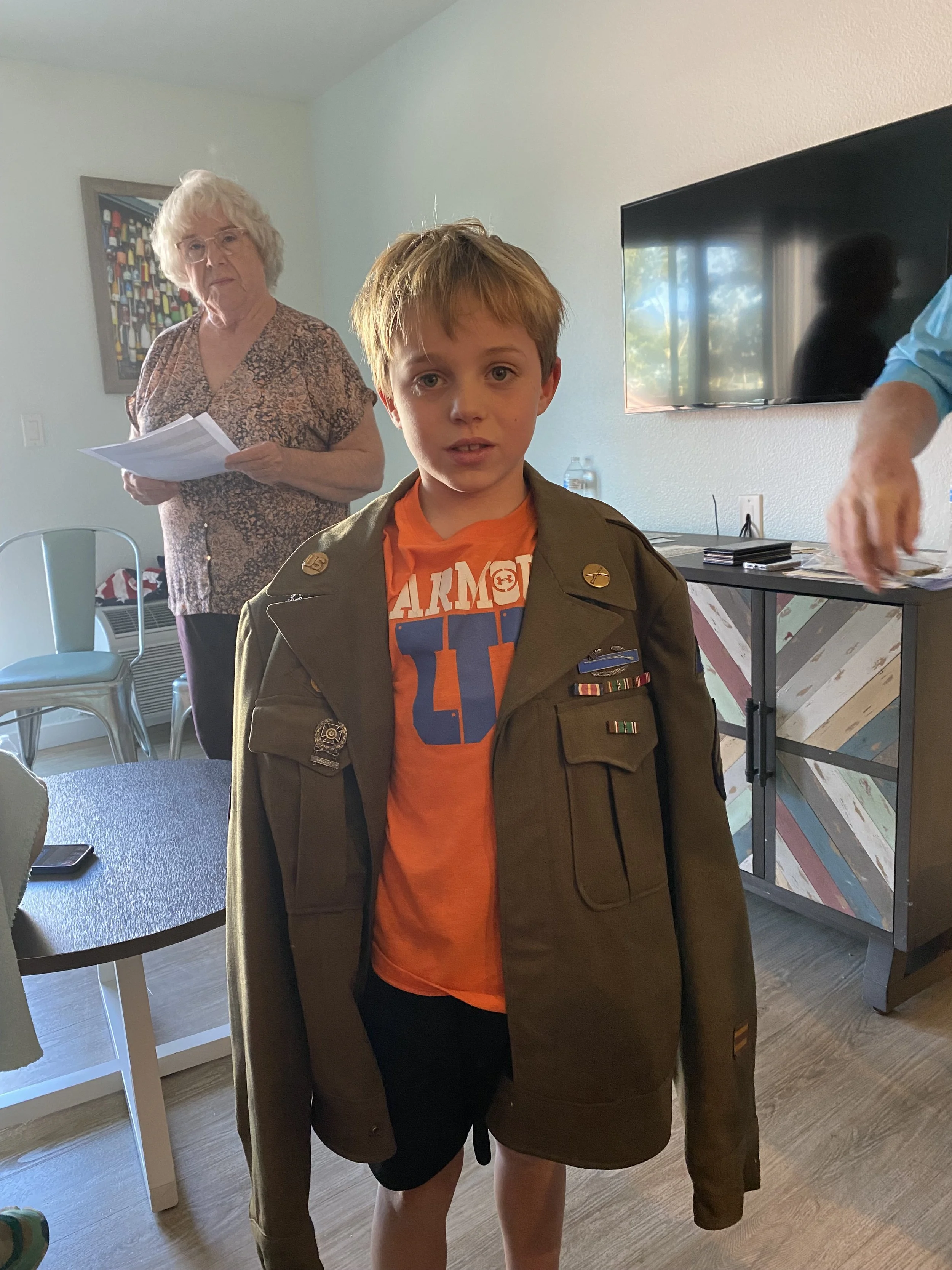 Bowen tries on his Great Grandfather Moyer’s flight jacket - November 20, 2022 - San Diego