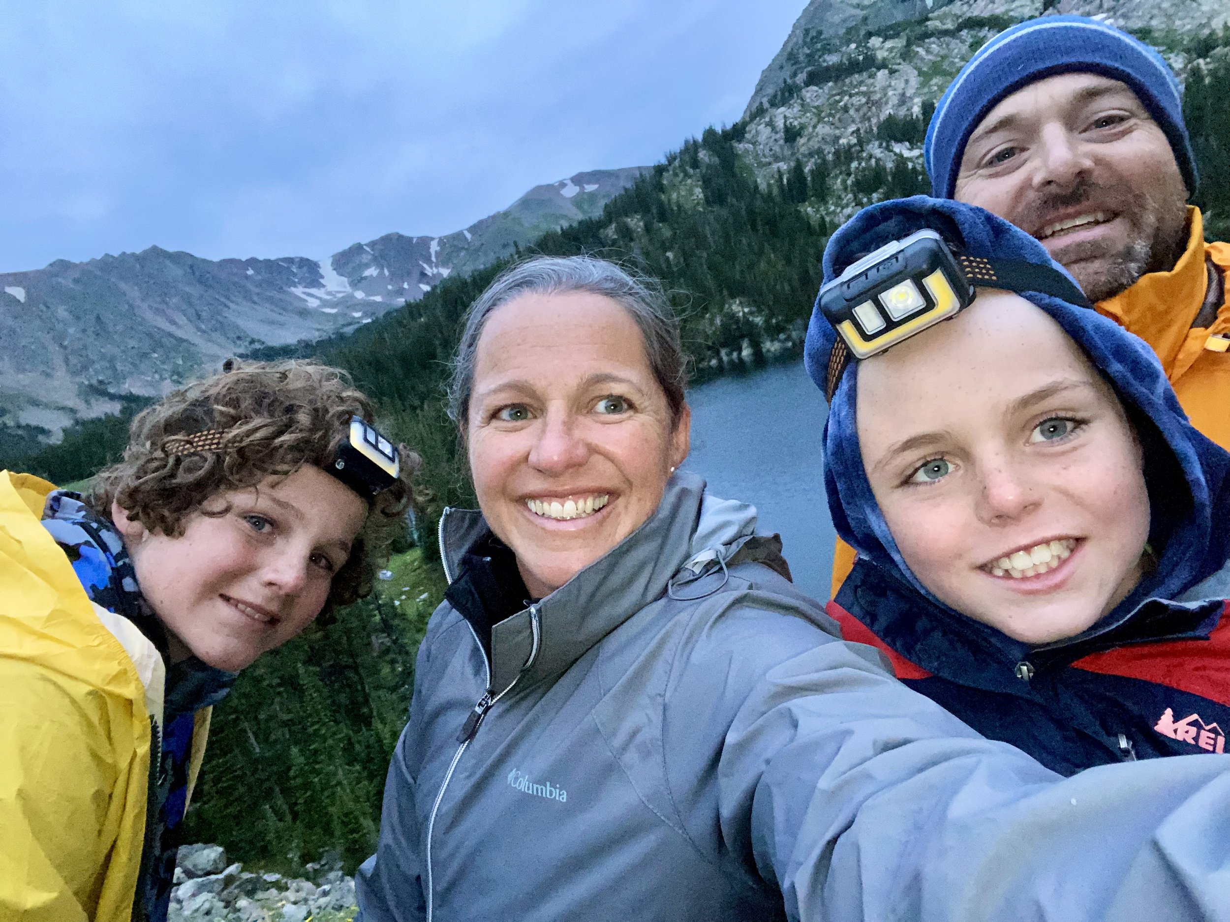 Jill, Jared and Jeff Joost take the “Middles”, Beckett and Caleb, back packing on a rainy trip to the Colorado Mountains in July 2022
