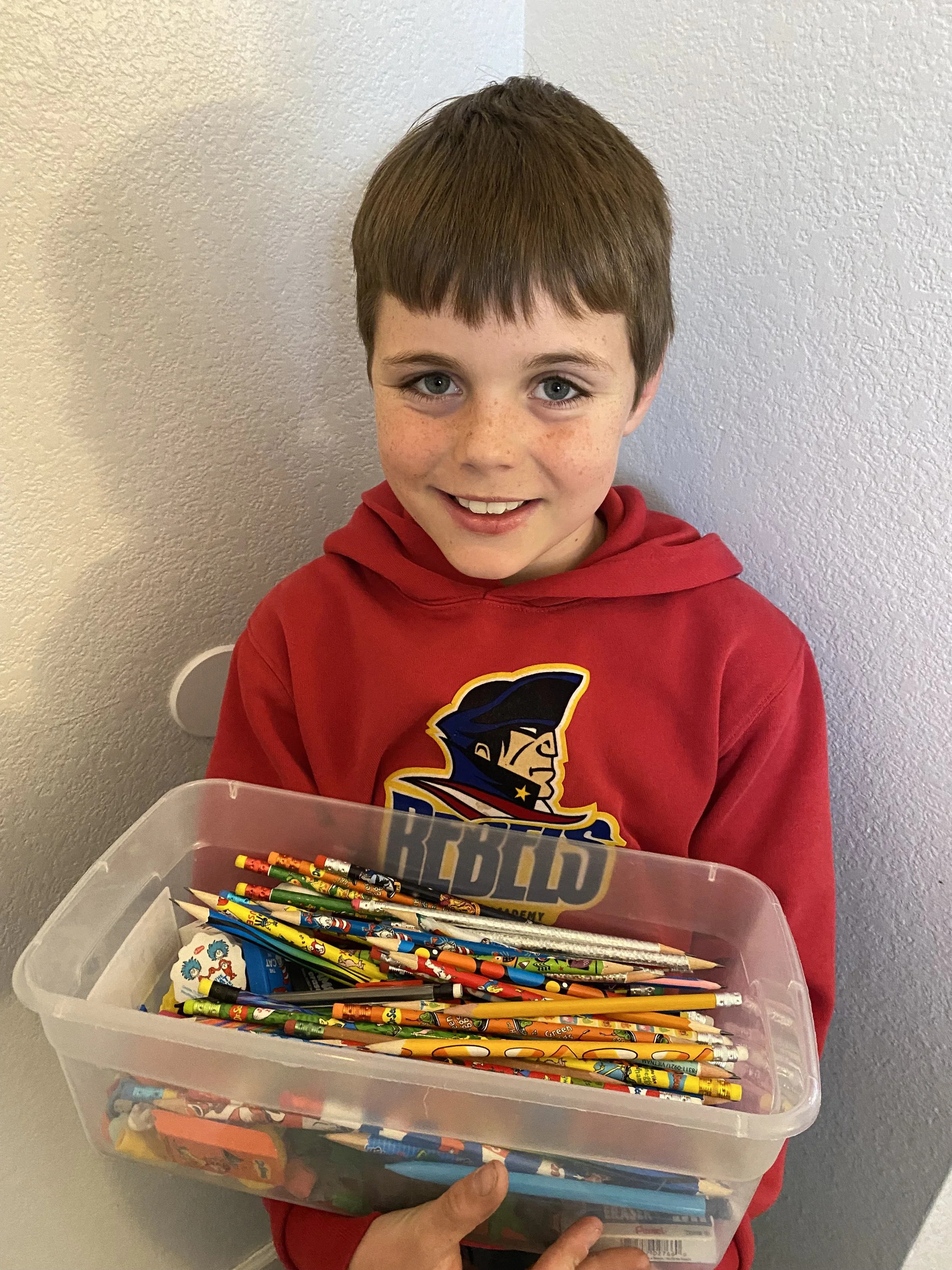 Caleb loves to collect pens and pencils, also little notebooks and stationery.